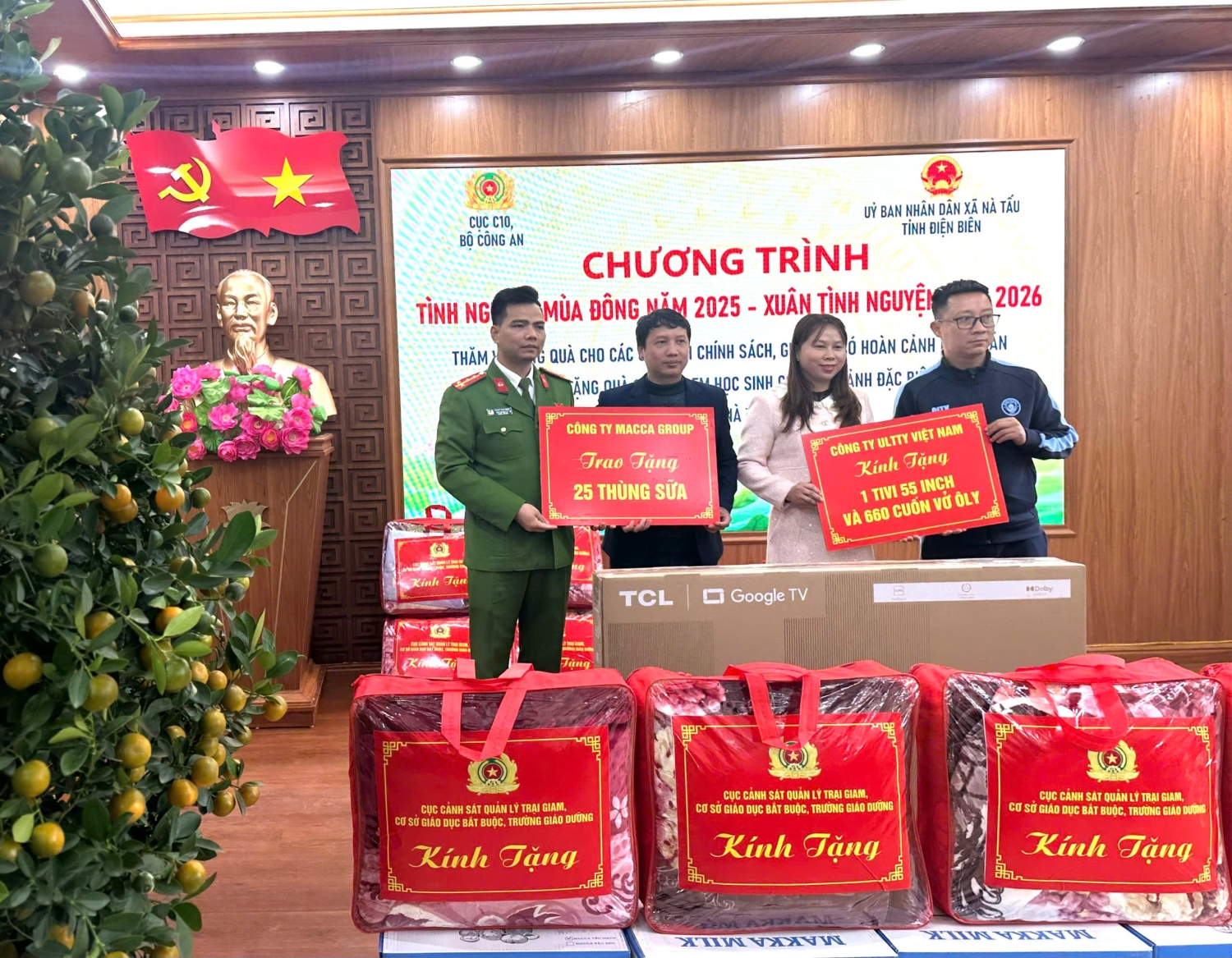 Đại diện bên trao tặng có Đại tá Nguyễn Thị Kim Tuyến – Trưởng phòng Công tác Chính trị và các đồng chí đại diện Ban thanh niên, ban phụ nữ của Cục C10 Bộ Công an. Nhà tài trợ Ông Dương Trọng Quý, phó chủ tịch HĐQT công ty Ultty.